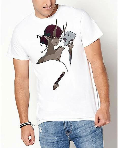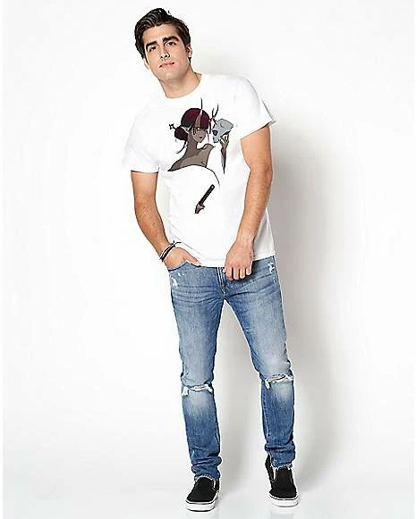 This soft white crewneck tee features the dreamlike art of Lewd Complex. This t shirt features a sinister beauty holding a skull as she peers into the distance.