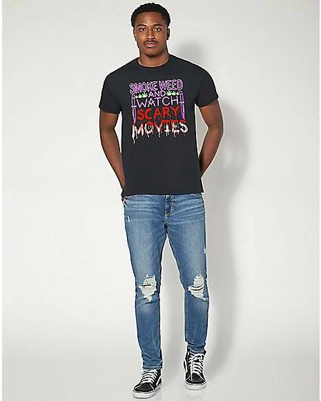 Show off your two favorite activities with this Smoke Weed and Watch Scary Movies t shirt! You’ll be sure to make your friends laugh whenever you put on this funny graphic tee.