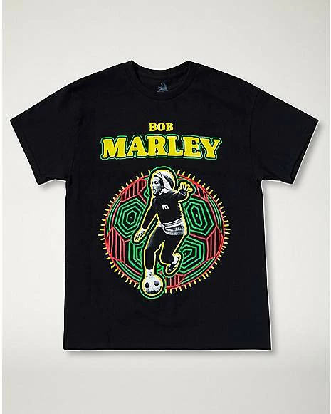 Instantly elevate your vibes and your style when you wear this officially licensed Bob Marley T Shirt. Featuring an image of the legendary artist playing soccer, this tee is perfect for any fan. Put it on and crank up your favorite track!