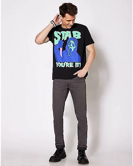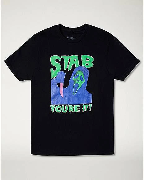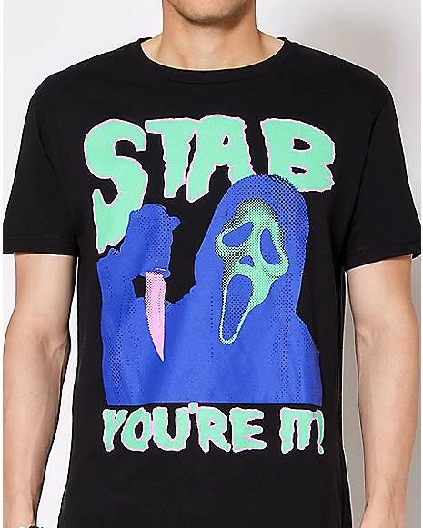 Playing tag with your favorite horror villain isn’t as fun as it sounds. If you love Ghost Faceยฎ, then getting yourself this officially licensed Stab You’re It T Shirt is a must! This hilarious top is perfect for any fan of the iconic killer.