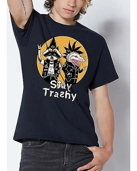 It’s cool to be trashy. This soft black graphic tee by Vincent Trinidad features two trash-dwelling creatures who want you to stay trashy.