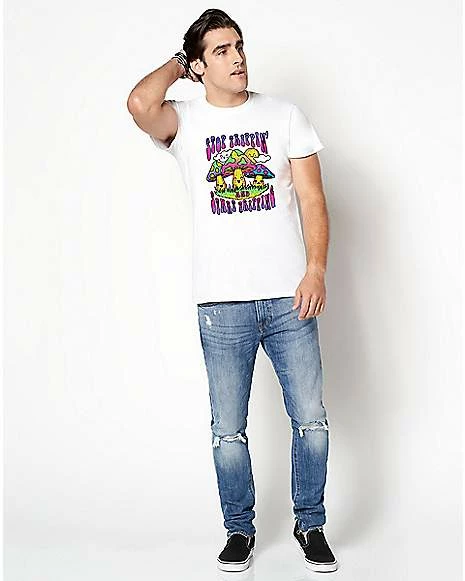 Everyone will know you’ve come to party when you show up wearing this Stop Trippin and Start Tripping T Shirt. This trippy tee is the perfect addition to your wardrobe and is perfect for getting plenty of attention at the next party.ย