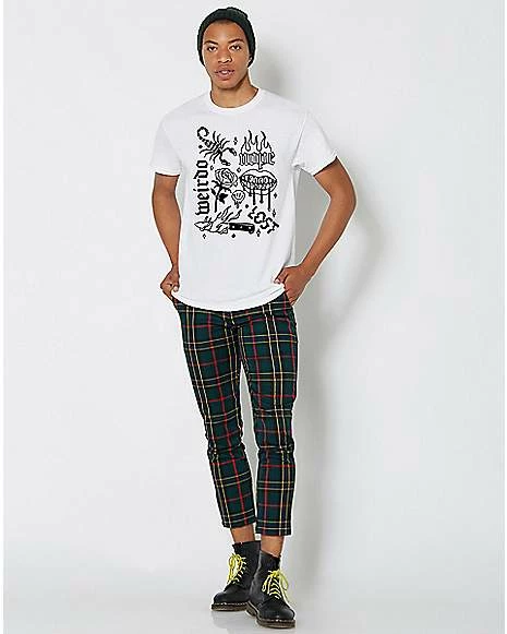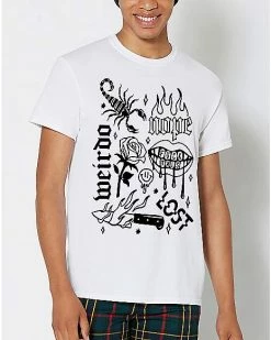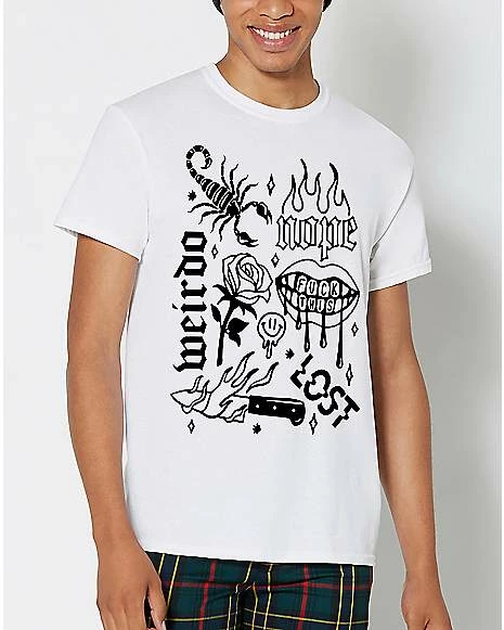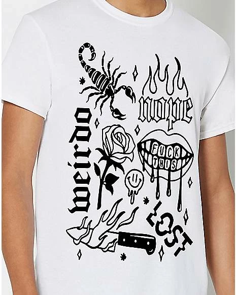 Weird and beautiful graphics make this white tee a work of art. Surreal prints like a flaming knife and a melting smiley face add personality to your ‘fit!