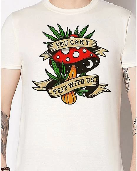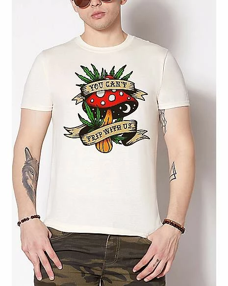 You can’t trip with us! Make room at the table for your new favorite graphic tee. This mean tee features groovy shroom and weed graphics.